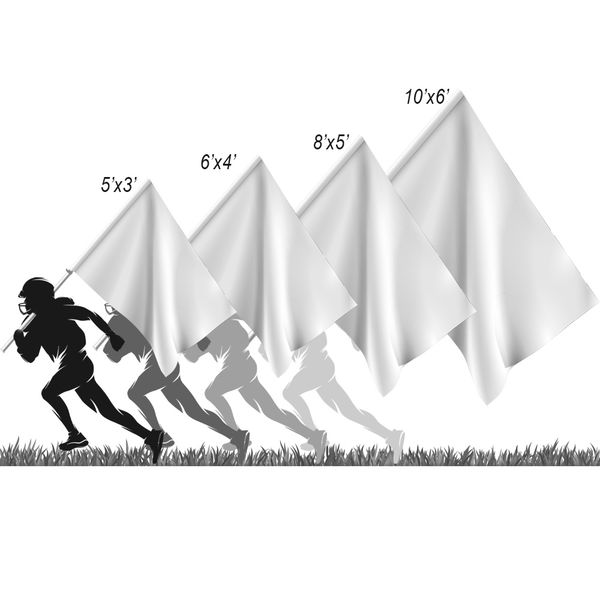 We offer our flags with four standard sizes to choose from: 3ft x 5ft, 4ft x 6ft, 5ft x 8ft, and 6ft x 10ft. All sizes are easy to spot from the sidelines or stands with the largest sizes being the most effective for stadiums and expanded fields.