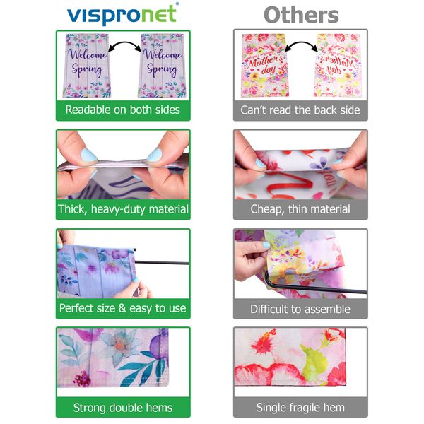 Welcome spring to your home garden or the front of your shop with these spring garden flags. Our spring flags are available in several ready-to-ship stock designs. Our spring yard flags last longer compared to the usual store-bought flags. This is because our flags are made from durable Display Polyester, which is a knitted fabric that holds up in changing outdoor weather without the flag ripping or the print bleeding. We print the design on both sides of the flag so that the spring themed message is visible to passersby in different directions. The flag comes in a classic 12in x 18in size, which is easy to spot and read from a distance. Not only do the flags last a long time, but so do the optional hardware stands, which are lightweight and easy to setup. The entire spring flags set assembles in a few minutes without tools. These spring garden flags are the perfect addition to your seasonal home and shop décor.