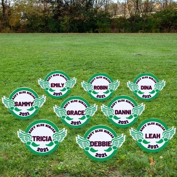 Celebrate someone you know who competes in track and field with these track and field yard signs. These signs are made from durable corrugated plastic material, which is designed for outdoor use. The material holds up in all kinds of weather due to the weather resistance and UV protection. We print the custom design using a digital printing technique for bold colors that can be seen from a distance. Like the material, the print is also designed to withstand the outdoor elements. Personalize the sign with the name of the athlete, the team’s name, the school year, and colors to be printed on the winged shoe shaped sign. Assembling these track and field signs is easy. The included stakes push into the ground. The sign slides on by pushing the top of the stake through the sign flutes. Once the sign is set up outdoors, it can be displayed for an extended period. The colors will not fade, and the sign will not crease or bend from the weather. Showcase the name of an athlete in your family with these high school track signs.